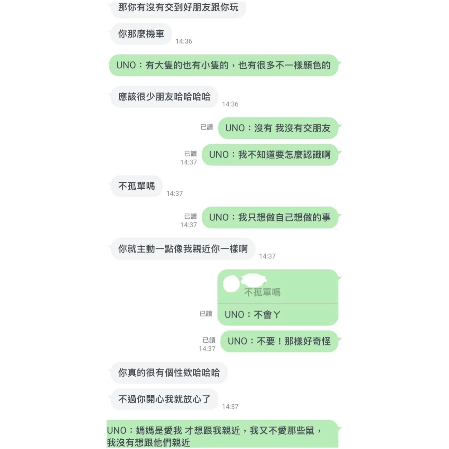 UNO:「媽媽是愛我才想跟我親近,我又不愛那些鼠鼠,所以沒有想跟他們親近啊」